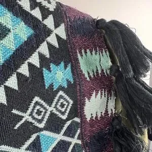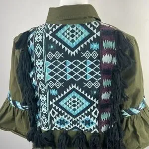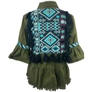-Beautiful jacket with hidden buttons, embroidered back and fringe hem.