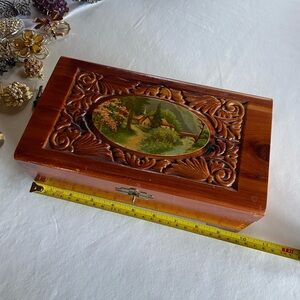 Vintage lot of 1950’s and 1960’s brooches includes 2 wishbone brooches and a circle faux pearl brooch marked “Japan.” The 2 butterfly brooches have clip closures. The jockey with surrey pin has a working wheel. All are in excellent working condition. The wooden jewelry box with wooden feet is about 10 inches wide; about 5.5 inches deep; and about 4 inches tall. The interior mirror is aged with some tarnish. The top is carved and covered with the countryside scene. It is in excellent condition.