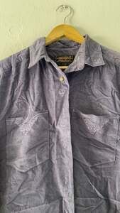 Vintage Eddie Bauer corduroy shirt in a distinctive purple hue, featuring intricate embroidery details on the collar, front pockets, and button placket. This long-sleeve button-down offers a classic, comfortable fit. Perfect for a retro-inspired look or adding a touch of unique texture to your wardrobe. Excellent pre-owned condition.
