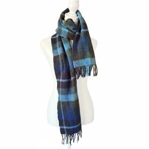 J Crew By Moon England Mens Merino Wool Blue Plaid Knit Scarf Fringe