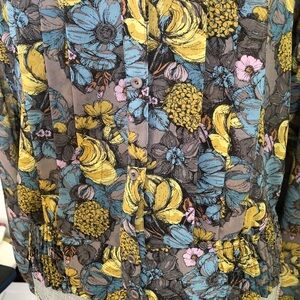 Hinge pretty floral sheer top. Full buttons down front. Pleating front and back. Elastic band waist line. 100% polyester. Gorgeous!