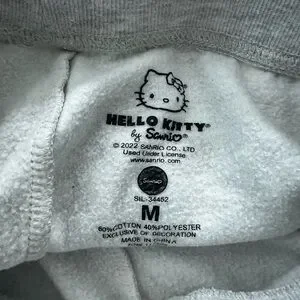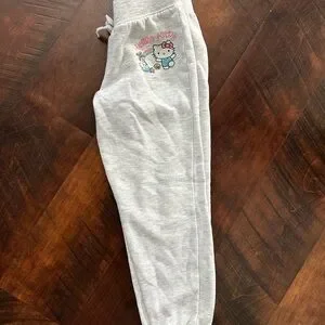 Adorable Hello Kitty sweatpants in light gray. Features cute Hello Kitty design. Ideal for casual wear.
