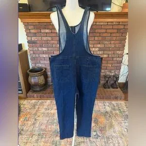 Stylish dark blue denim overalls. Features front zipper and pockets. Perfect for casual wear.