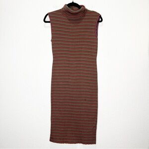 Fitted style. Turtleneck. Sleeveless. Knee length. Striped in warm earth tones. Knit.
