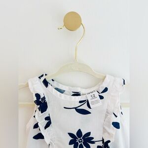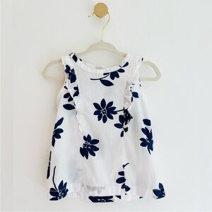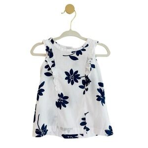 Sleeveless baby girl Carter’s Aloha blouse with navy blue floral design. Ruffled accents add charm. Three button closure in back for ease of changing. Very pretty and perfect for a summer vacation!