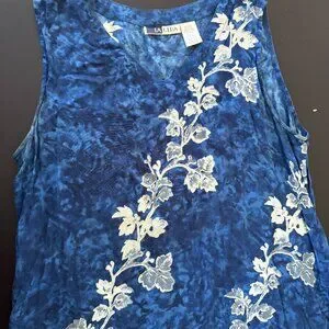 Beautiful La Cera women’s sleeveless dress in a rich blue tie-dye pattern with white floral embroidery.