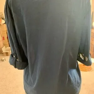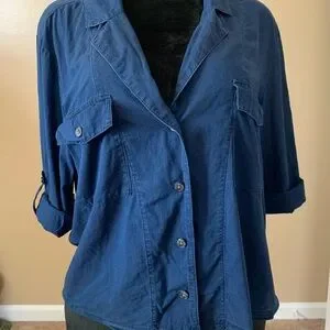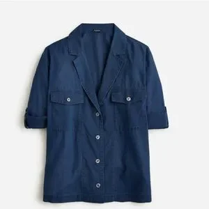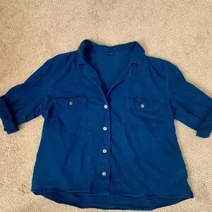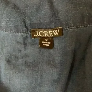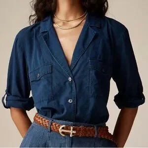 J Crew Camp Collar Shirt Womens 12 Blue V Neck Cotton Voile Button Up Roll Tab