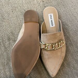 Elegant Steve Madden mules in beige. Features bold gold chain detail. Perfect for versatile styling. Barely worn.