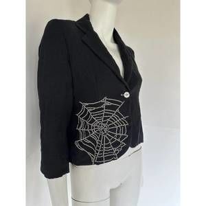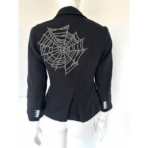 Embrace the edgy elegance of the Women's Spider Webs Blazer by Libertine, perfect for grunge-inspired evening events. This blazer in a striking black features textured linen material and three-quarter sleeves for a standout look. It is equipped with a classic button closure and a tailored collar for refined appeal. Proudly made without pockets, this piece is ideal for the spring season.