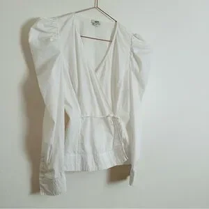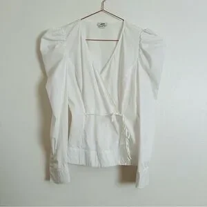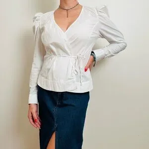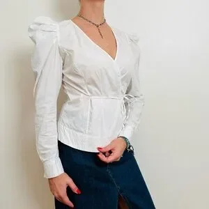 This elegant white wrap top features a flattering design with puff sleeves, perfect for any occasion. Its classic style makes it a versatile addition to your wardrobe.