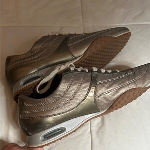Stylish Cole Haan shoes/sneakers. Metallic Gold with ivory laces (may look like silver in picture; however, it is a subtle gold. Size 7.5B Very soft leather and so comfortable, very minimal wear, perhaps once. Comfortable and chic. A very nice and stylish “walk about” shoe/sneaker.