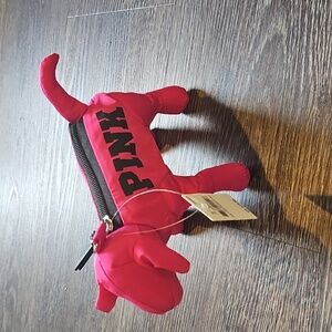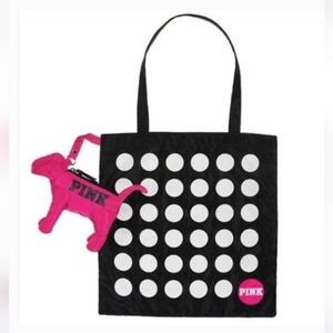 PINK logo dog with zipper/ring which opens to a small polka dot tote bag! Tote is approximately 13" x 13" with 9" handle drop.