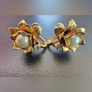 vintage screw-back earrings featuring a gold-toned floral design with a faux pearl and a rhinestone accent.