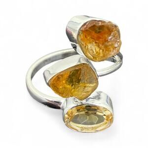 This lovely ring features natural Citrine gemstones in rich yellow and orange hues. One stone is faceted and the other two left raw. All are bezel set.