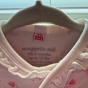 Charming pink one piece with floral pattern. Features convenient magnetic closure. Soft and comfortable fabric.