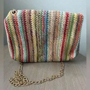 Stylish multicolor woven crossbody bag featuring a gold chain. Perfect for any occasion. Never used, boutique bought