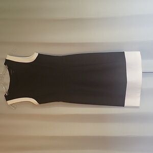 Sophisticated sleeveless midi dress. Features a classic black design with striking white accents. Perfect for any occasion.