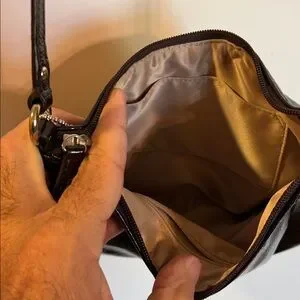 This is a Coach Hobo Crossbody bag in a deep Ox Blood Patent Leather with a tan satin fabric lining and shiny chrome hardware. This bag is in flawless condition and considered NWOT (new without tags).