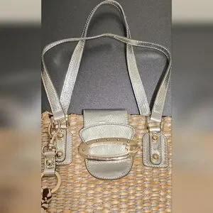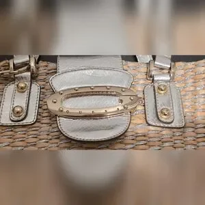 Guess Metallic Straw Tote Bag with Silver Faux Leather Trim & Scarf | Y2K