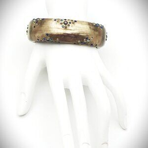Gorgeous Alexis Bittar hand carved brown Lucite & multi color crystals hinged bangle bracelet is approx. 15/16" wide, 7" long.