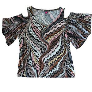 Vince Camuto Cold Shoulder Top Abstract Marble Print Flutter Sleeve Blouse L
