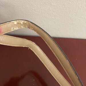 This is a white tote with a orange snake skin design! It’s in good condition! The handles are a little worn! See in pictures below.