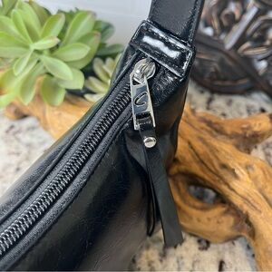 Small black patent leather hand bag, perfect for any occasion. Features a sleek design with a comfortable strap. Has one interior pocket.