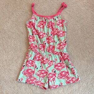 Charming romper with pink flamingo design. Features playful straps and elastic waist. Ideal for fun outings.