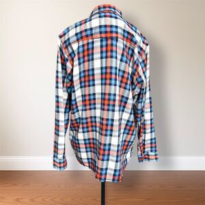 Stay warm and stylish in this North Face mens 2XL flannel shirt featuring a bold red and blue plaid pattern. Crafted from 100% cotton for soft comfort, its perfect for layering through fall and winter.