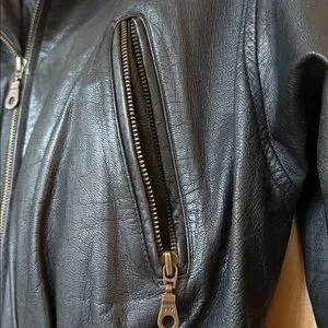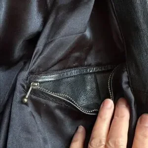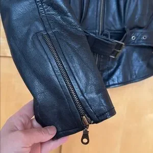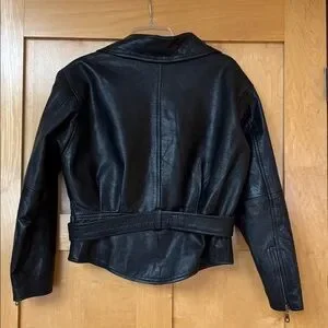 Stylish Avanti jacket in black leather and lined. Features a stylish design, zipper sleeves detailing and cute bottom hemline. Zipper front and wide belt. 2 Zipper pockets outside and one inside. Excellent condition, too small for me now. It is a moto style jacket and meant to be short.