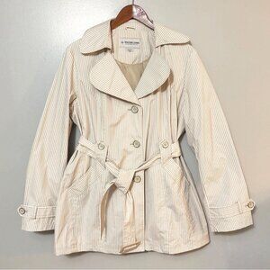 Weather Tamer Womens Beige & White Striped Trench Coat L Double-Breasted Belted