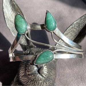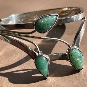 Vintage Heavy Taxco Aventurine Sterling Silver Hinged Cuff Floral Bracelet