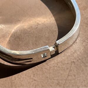 The clasp is a pressure hook on the open end of this hinged bracelet. This may be an issue for someone who has a weak grip, like me, as the silver is so thick, it is hard to push it in to loosen the hook or tab. I had to press it down against the table to get the pressure needed to move it out of its space. The good news: it definitely is not coming undone while you’re wearing it. I would still be tempted to keep this even though it’s more difficult for me to get on and off because it’s so beautiful.