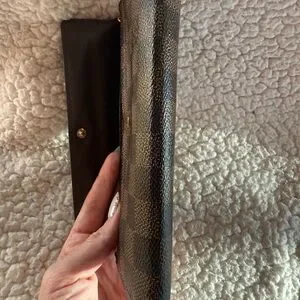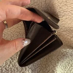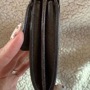 Stylish LV wallet with classic design. Features a secure button closure. Perfect for everyday use. Check all pictures, small tear in one side, no peeling, and the card slots in front are a little warped. She’s cute as a wallet or add a chain and show her off!