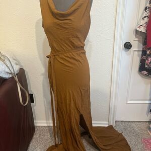 This item was never worn is was handmade and originally 425$ it is made to be tailored so it it currently very long (72in) to be hemmed to a perfect length color is toffee