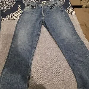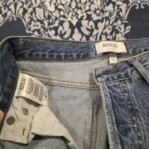 Chic straight leg jeans by Agolde. Available in light and medium blue shades. Perfect for casual style. Great for date night!