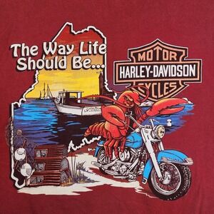 Eye-catching Harley-Davidson graphic tee featuring a unique lobster-riding-a-motorcycle design. This vintage t-shirt showcases a Central Maine Harley-Davidson dealership logo on the back, along with a vibrant graphic of a lobster riding a motorcycle in front of a Maine coastal scene. The front displays the classic Harley-Davidson emblem combined with imagery reflecting Maine's coastal culture, including lobster traps and a lobster boat. This tee is a distinctive piece for Harley-Davidson enthusiasts and collectors of unique graphic shirts.