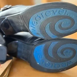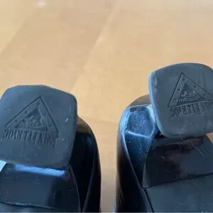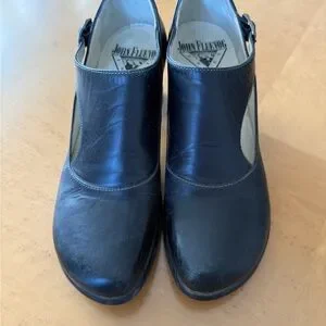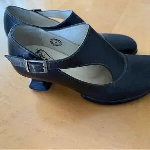 Chic black leather heels by John Fluevog. Sleek design with a comfortable fit. Made in Portugal.