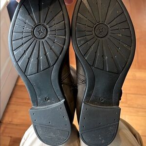 Stylish brown leather riding boots. Features a side zipper and buckle detail. Perfect for any occasion.