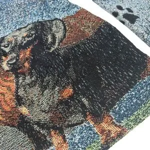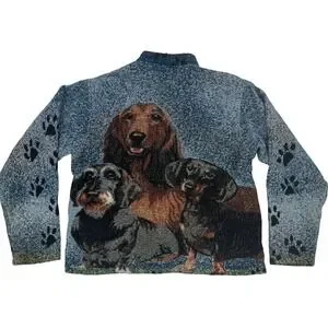 Distinctive tapestry sweater featuring an all-over dachshund dog print design. Showcasing a unique woven texture, this button-up jacket boasts a stand-up collar, long sleeves adorned with paw print accents, and a comfortable, relaxed fit. The front of the jacket features two prominent dachshunds, while the back displays a trio of these beloved dogs.