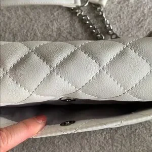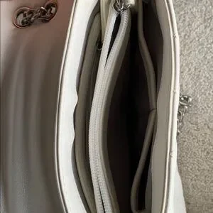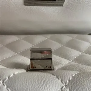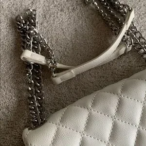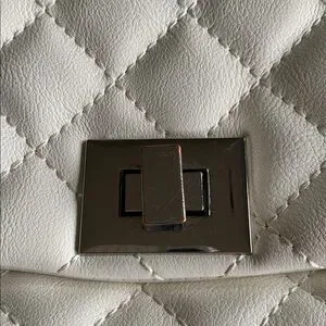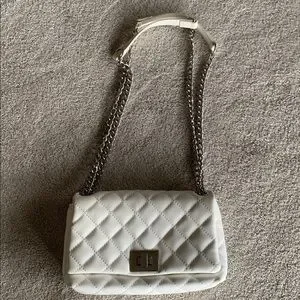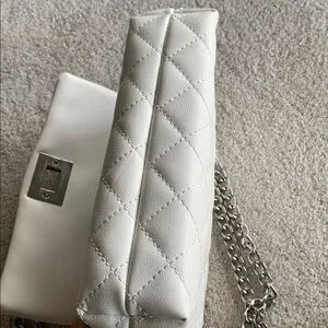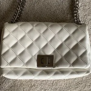 Chic cream quilted crossbody bag with chain strap. Convertible short or long strap. Features a sleek clasp closure. There is an outside pocket for your phone.