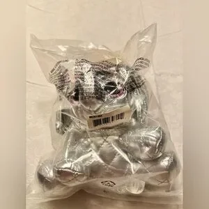 Adorable silver elephant plush. Features big purple eyes. Soft and cuddly design. 6”