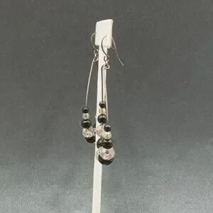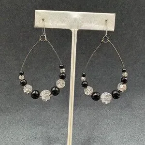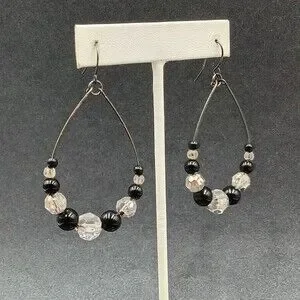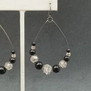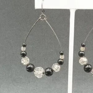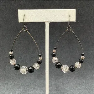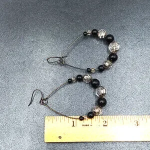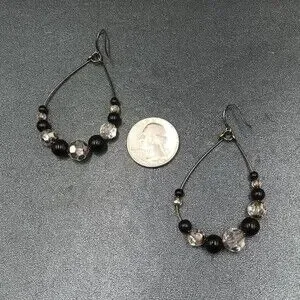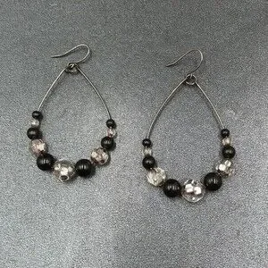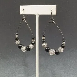 Pierced Earrings Gun Metal Gray Teardrop Wire Loop Acrylic Beaded Dangle 2"
