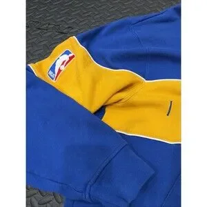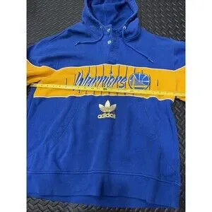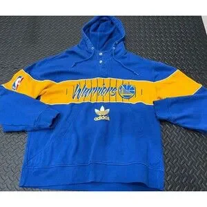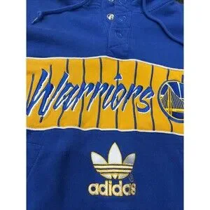 The product is a rare vintage Adidas Golden State Warriors button-up hoodie in size XL, featuring NBA logos and player names such as Curry and Butler. This officially licensed merchandise from the National Basketball Association (NBA) is a must-have for any basketball fan of the Golden State Warriors. Made by Adidas, this unique hoodie combines style and passion for the sport of basketball, making it a valuable addition to any fan's collection.