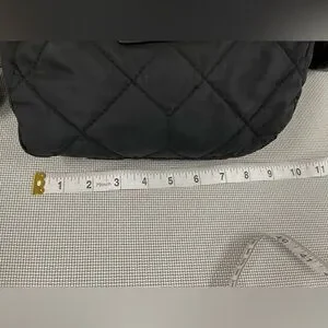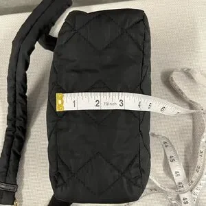 A lightweight convenient yet stylish crossbody purse by Marc Jacobs New York. Quilted, with an adjustable strap and internal pocket with a zipper. Black with gold accents.