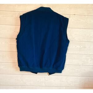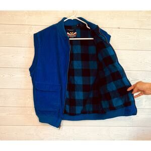 Bonkers of London blue corduroy vest. Vintage 1990’s. Lined with blue & black buffalo plaid flannel. Knit ribbed trim. Gold tone zipper. Flap front pockets. Approximate measurements pit to pit 22”, shoulder to hem 25”, size large. Excellent preloved condition..