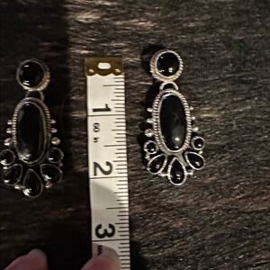 These sterling silver and black onyx earrings were purchased in Santa Fe, New Mexico several years ago. The jeweler had no larger black earrings so he fused 2 pendants to the earring posts to make them for me. Unfortunately, they are too heavy for my ears which are thin lobed and I have to let them go. Very elegant and in great condition.