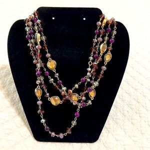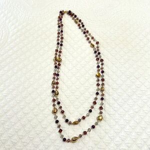 Purples, Grays, clear and Amber Beads strung on a delicate gold tone chain - 38” Long