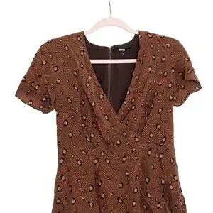 Slate + Willow Brown Faux Wrap Silk Dress. Wrapped and ruffled, this leopard print silk dress is ready to pounce from work to weekend. Brown printed crepe. Short sleeve. V neckline. Hidden back zipper with hook and eye closure.