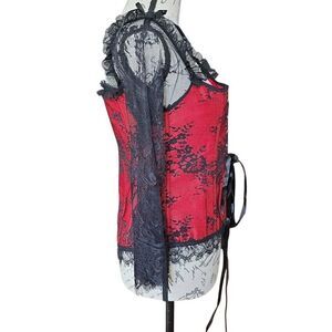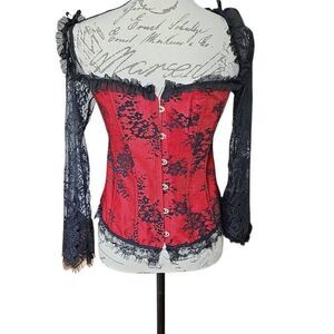 Make a bold fashion statement with this dramatic hook-close corset top. This women's size 2XL top is perfect for adding a touch of fantasy to your wardrobe, whether for a themed event, a night out, or cosplay. The beautiful red and black design features delicate lace on the 3/4 sleeves, giving it a regal, renaissance-inspired feel. The structured fit and back hook-and-eye closure provide a flattering and secure feel, while the front lace-up detail allows for a customizable fit. This top is in excellent condition and is ready to create a truly memorable look.